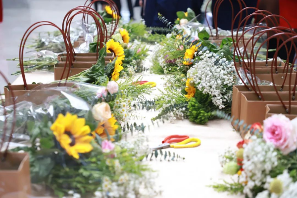 現場插花環節,“女神”們拿起喜歡的花朵,認真構思,修剪枝葉,搭配色彩,興致勃勃地創作,熱烈地相互交流,現場充滿歡聲笑語。